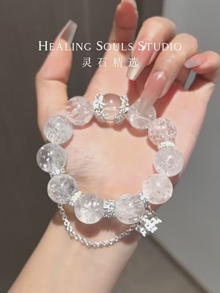 • This Natural Clear Quartz & Azeztulite Bracelet with snowflake charms channels pure, high-vibrational energy. In Feng Shui, clear quartz acts as an "energy amplifier," while Azeztulite (a rare white crystal) is believed to carry divine light frequencies. The snowflake motifs symbolize purification and new beginnings, aligning with the "Qian Gua" (Heaven trigram) for clarity and divine guidance.